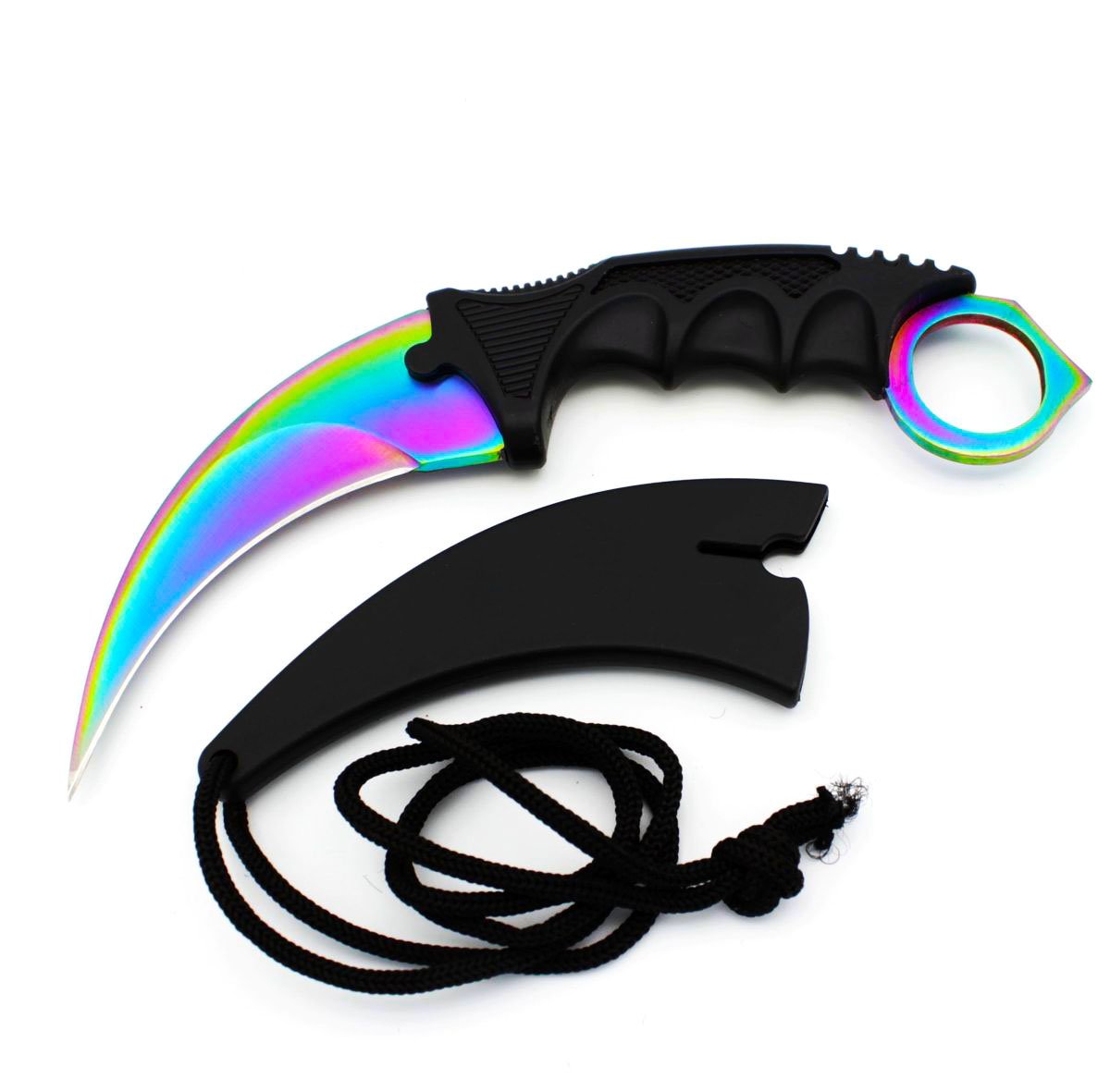 Ніж керамбіт в чохлі, зроблений з хорошого стального сплаву, рукоятка із пластику, має кільце під палець і шнурок для кріплення.
