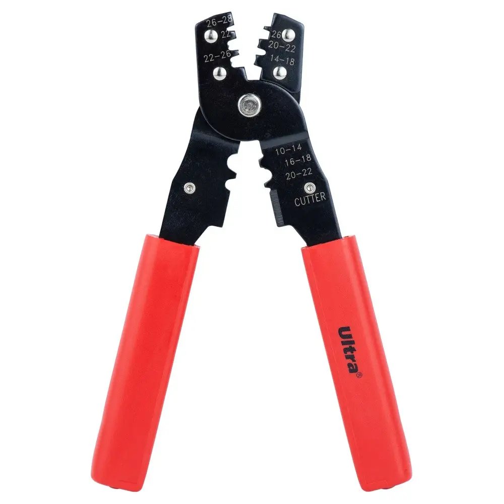 Кліщі для опресування неізольованих клем 0,5—4 мм² Ultra — професійний інструмент для роботи з проводами будь-яких типів. Виготовлений із високоякісної легованої сталі, яка гарантує довговічність виробу та високу точність проведених робіт упродовж тривалого часу. Сталева конструкція довго слугуватимуть вам вірою й правдою, а зручність у роботі забезпечують додаткові накладки з пластику на ручках. Ефективність роботи автоматичного знімача ізоляції полягає в моментальному знятті ізоляції без видимих пошкоджень самої жили. З таким інструментом можна не тільки знімати ізоляцію з проводів, але й перерізати сам провід завдяки заточеному міцному лезу.
