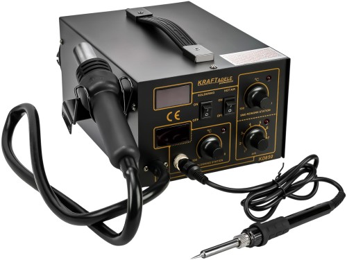 | Skład zestawu: • Skład zestawu • Stacja lutownicza KD850 • Dysza okrągła 3 mm • Dysza okrągła 5 mm • Dysza okrągła 10 mm • Dysza kwadratowa 12 mm • Polska instrukcja obsługi • Gwarancja 12 mc | Cechy: • 2 niezależne wzmaczniacze operacyjne • System ESD Safe lutowania anytstatycznego • 4 dysze do spawania w różnuch rozmiarach • Funkcja lutowania • Wylutowania • Spawania • Funkcja lutowania bezołowiowego - lead free |