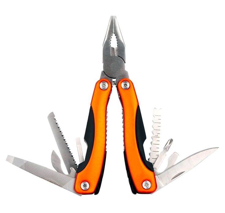 Викрутка, Відкривачка для пляшок, Долото, Ключі накидні, Консервний ніж, Кусачки, Лінійка, Ніж, Пила, Плоскогубці (пасатижі), І т.п.